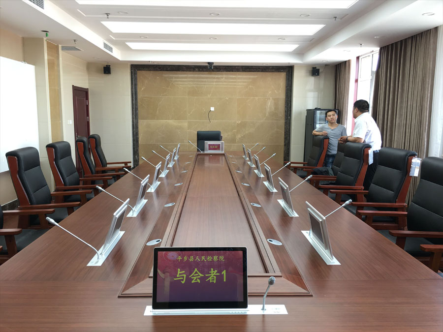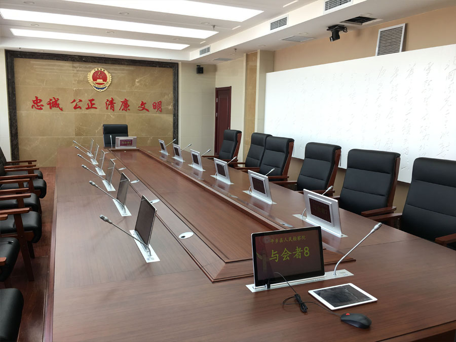 華韻無紙化會議系統(tǒng)支持任何多媒體會議終端播放的視頻文件同步到其它會議終端與大屏幕或只同屏到大屏幕顯示;支持會議簽到、投票表決、交互式電子白板、文件標注、會議交流、會議服務、會議通知等功能;支持會議文件智能推送功能,后臺文件按會議進程自動按權限推送到前端會議終端;支持文件推送權限設定,無權顯示的會議終端自動屏蔽該文件顯示;兼容常用辦公軟件與文件格式;支持PPT文件自定義動態(tài)播放,保證PPT播放特效,支持任何會議終端一鍵同屏顯示功能;具備異步瀏覽功能,支持任何有權限會議終端一鍵切換遠端或本地終端畫面完成信號自由交互;支持跟蹤主講功能,處在異步瀏覽狀態(tài)的會議終端支持一鍵同步到主講此時的文件與視頻畫面;支持外部信號同屏到所有會議終端并同步顯示,包括視頻信號、電腦信號、DVD碟機信號等。無紙化會議系統(tǒng)與話筒采用嵌入升降一體式,可獨立控制顯示屏與話筒的升降,采用智能可編程中央控制系統(tǒng)可實現(xiàn)同步升降,操作方便、桌面平整。